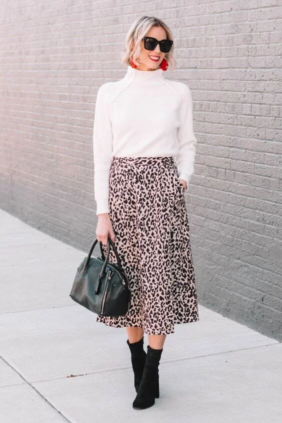 Stay warm in the office with an oversized sweater over a printed silk midi-skirt. Coordinate it with a comfy kitten heel if you know you’re going to be on your feet a lot. Read How To Style Your Favorite Skirts for Winter to learn more.